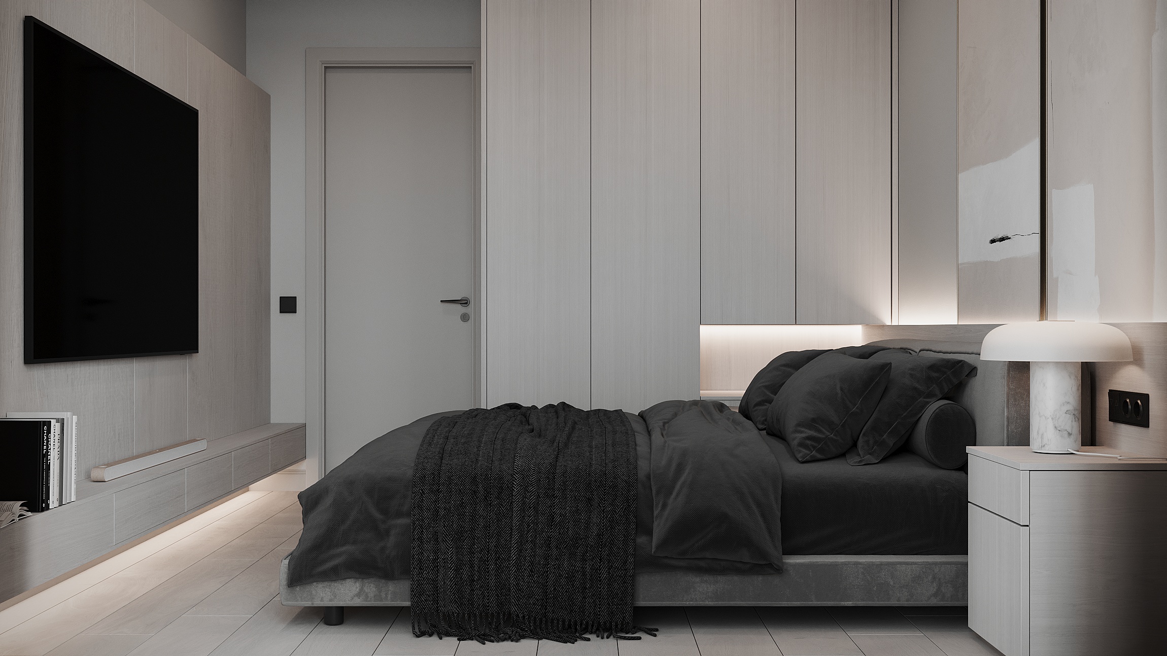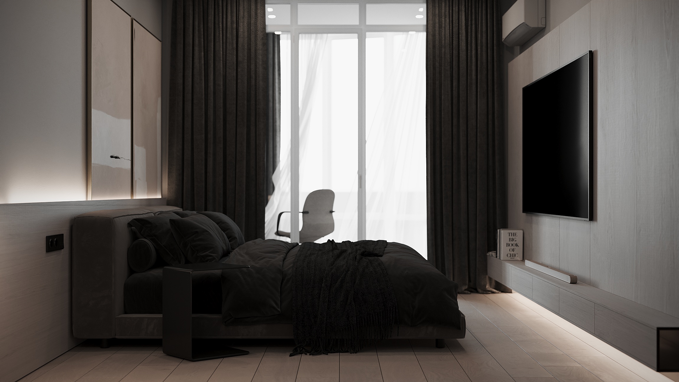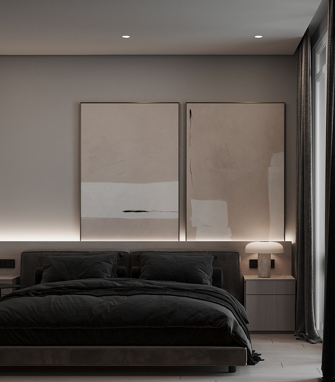 Сочетания расслабляющих темных оттенков, минималистичного дизайна и теплого освещения определяют стильный уют интерьера